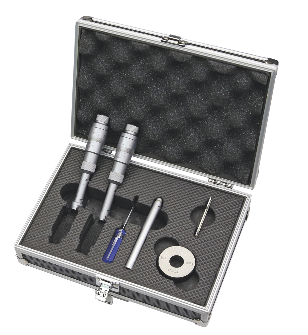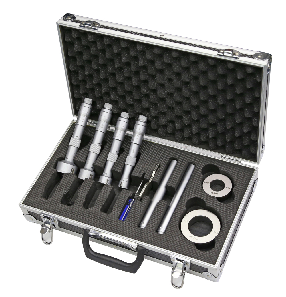 Three point internal micrometer set with setting ring and extensions